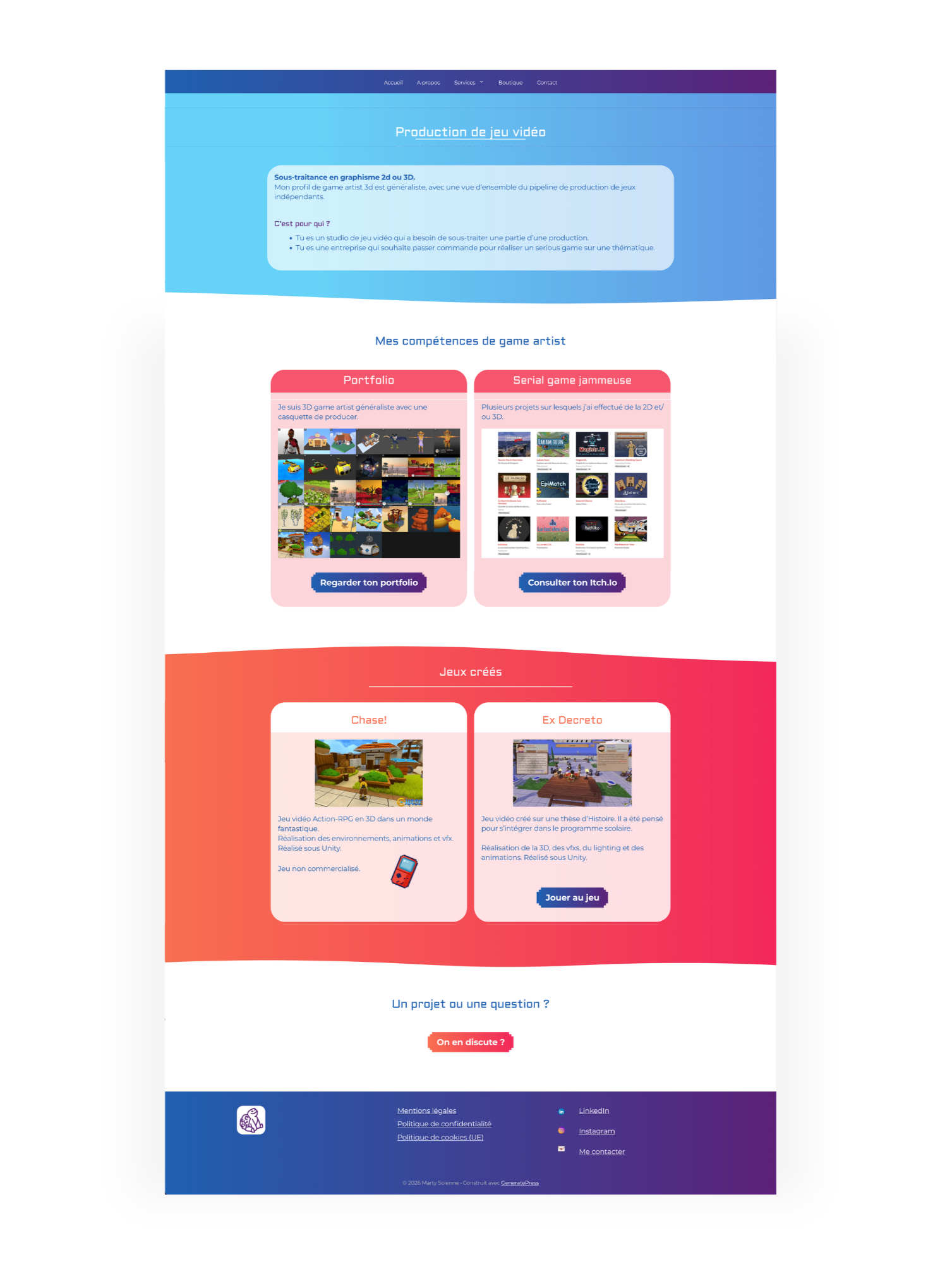 On a au final un Linkedin et un site professionnels, clairs, qui montrent sa personnalité et son unicité avec des icônes en pixel art, et présentent de manière clair ses services de création et de formatrice.